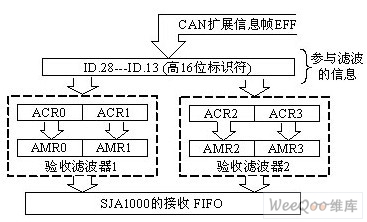 电力远程监测管理系统中,主、从集中器作为CAN总线的节点都工作于增强模式(PeliCAN mode),以扩展帧双滤波方式传递报文。对于扩展帧而言,滤波器1由ACR0、ACR1、AMR0和AMR1构成,滤波器2由ACR2、ACR3、AMR2和AMR3组成,扩展帧格式的CAN信息帧的29位标识符中也只有高16位(ID28~ID13)参与了滤波。两个滤波器在过滤数据时是“或”的关系,即只要CAN信息帧通过其中任意一个滤波器的验收,就可以被接收。如图3所示即为扩展帧格式的双滤波器验收滤波流程图。