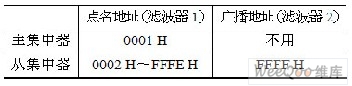 系统为每个CAN节点的滤波器1的验收码寄存器ACR定义了不同的数值,用以区分不同的集中器,即为集中器分配了地址,其中主集中器的地址为0001,这是区分主、从集中器的标志。有了这个CAN节点地址,分布式系统中的主集中器就可以和系统中任意一个从集中器交换数据,即进行点对点双向通信。所有从集中器的滤波器2的ACR值均为FFFFH,作为接收主集中器广播数据的地址。主、从集中器的地址分配如表1所示。