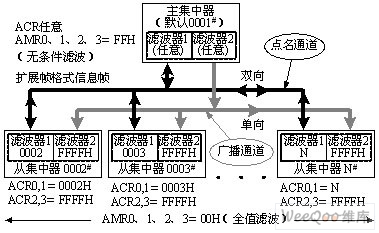 进行点对点双向通信(点名)时,主集中器发送的信息帧高16位标识符即为从集中器的地址(点名地址)。系统所有从集中器的验收屏蔽码AMR全为0,即要求滤波器1和滤波器2进行全值滤波,只有当从集中器的滤波器1验收码ACR设定值与主集中器发送的点名地址完全相符时,该从集中器才可以接收数据。主集中器的验收屏蔽码AMR全为1,实现无条件滤波,可以接收所有从集中器的数据,这个特点是主从式通信系统中主机所应具备的特点。