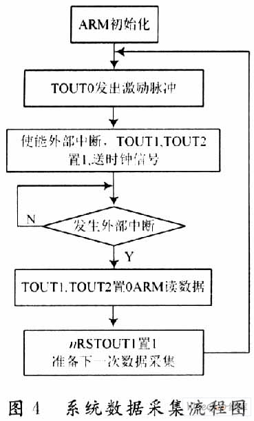 超声波测厚系统数据采集工作流程主要包括ARM初始化、输入激励脉冲、使能外部中断、时钟送入A/D、FIFO、等待中断。停止A/D及FIFO,ARM读数据,复位FIFO。流程图如图4所示。