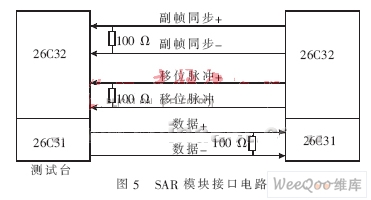 测量综合控制器测试台中SAR信号源模拟的是SAR压缩器,采用标准RS-422-A接口形式传输压缩后的图像数据(每字节8位的串行数据)。测量综合控制器每隔25 ms向测试系统发送取数请求信号,在取数请求由高变为低延迟一段时间后,测量综合控制器同时向测试台发送移位脉冲,测试台根据取数请求信号以及移位脉冲信号,向测量综合控制器发送相应的数据信息,其接口电路如图5所示。
