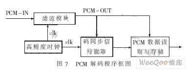 虽然对信号进行了隔离,PCM输入信号仍不可避免地存在各种干扰,这将影响码同步脉冲和PCM数据的提取,因此,在FPGA内PCM信号的输入端接入1个滤波模块。模块使用的是高精度时钟,频率是PCM码率的20倍(39.321 6 MHz)。PCM码(PCM-IN)在产生跳变后必须保持至少5个clk,才能被滤波模块输出(PCM-OUT),否则被认为是干扰信号,将被滤除。