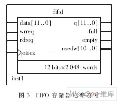 本系统中数据的存储是通过设计FIFO存储器电路实现的。FIFO存储器电路主要由一个双口RAM模块(Dual-Port RAM)和状态机模块(State Machine Table)组成,通过先进先出(FIFO)堆栈把数据存储在双口RAM中。其设计是在Matlab环境下利用Altera DSP Builder设计工具实现的。