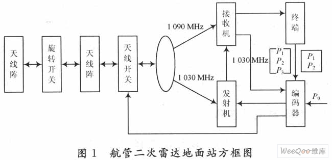 发射机在询问脉冲的调制下,产生1 030 MHz的射频脉冲,经三端环形器送到天线。天线在同步脉冲的控制下,将P1,P3进入和通道,P2进入差通道。接收机在将1 090 MHz的射频应答信号转换成视频信号,送至终端装置进行处理。