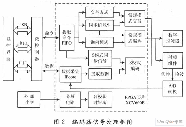 图2所示为编码器信号处理框图。它采用雷达显控界面、微处理器和FPGA芯片相结合的信号处理系统。对于编码器的设计主要实现上述三个功能(见1.1小节),采用IPcore技术提取界面下传数据采集和微处理器命令,采用分频电路产生各模块所需的时钟,依据询问命令产生同步编码信号S0。由此编码产生常规模式及其交替模式,S模式的询问信号。可用数字示波器进行实时测量;射频组件可对编码信号进行测试并产生线性检波信号,经A/D转换后,送入 IPcore采集数字信号,并上传至界面定性显示波形。