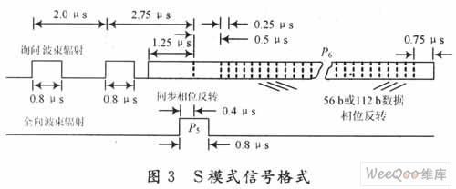 图3表示S模式询问格式。前两个脉冲P1和P2的脉宽为0.8μs,间隔为2.0μs。在P2脉冲后是一个长脉冲P6,它的持续期为其脉宽,取16. 25μs或者30.25μs,其中有许多相位为反转脉冲,用其携带发射数据。P6的最后24位为飞机地址,是通过全呼询问获得的。其中,第一个反相位于脉冲前沿后1.25μs,即P5为“同步相位反转”信号,提供给S模式应答器作为始终同步,从而对后续的数据进行对应解码;同步相位反转脉冲也用作应答信号发射的时钟参考。询问机通过计算同步相位反转脉冲的发射与接收到的第一个应答脉冲之间的时间间隔来测量飞机的距离。数据通过DPSK信号来发射反相位置的间隔为0.25μs,从而产生4 MHz的数据比特率。根据要求,整个发射数据的比特为56 b或者112 b。