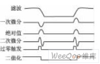 在每个行脉冲FC周期内对U0进行信号处理,过程如图3所示。将U0信号通过低通滤波电路,滤去高频干扰;对U0进行一次微分边界分离,然后通过绝对值电路将信号进行一致化处理便于进行二次微分;接着进行二次微分以提高分辨率,然后通过过零检测电路找到测量中心,最后进行二值化处理为后续的脉冲计数做好准备。