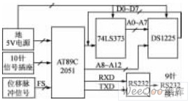 由单片机AT89C2051接收来自积分时间调整与信号处理模块的信号。在行同步脉冲FC周期内对标准脉冲计数,可得知U0波形工件成像的两个边界内的标准脉冲个数。找出标准脉冲与实测工件标准尺寸之间的关系进行标定校准,即可得出工件的实际尺寸。可暂时将测量值通过由74LS373和DS1225扩展的片外RAM存储下来,然后通过RS232串口发送给显示模块。