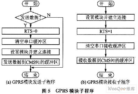 GPRS模块发送子程序和接收子程序的流程如图5所示。