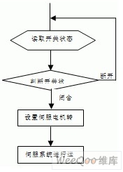 在冲床的工作过程中,要求机床滑块升起后,伺服送料机构才能开始进行送料,而在滑块落下前,送料机构必须完成定位过程。所以要求该系统的软件部分必须使机床的滑块与送料机构之间的动作协调一致。该系统利用MPC01卡的状态查询函数来判断冲床滑块的位置,来决定是否发命令给伺服电机进行进给运动。从而达到使滑块和送料机构之间的动作协调一致。