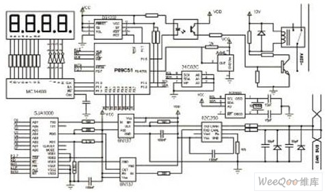 采集器采用单片机89C51,其内部有4KB的ROM,128字节的RAM以及32个I/O口。P1口与串行器件24C02和显示、继电器电路连接。其中的显示模块采用串行方式进行通信,分别采用P1.0、P1.1、P1.2模拟时钟信号线和数据信号线。24C02用来存储用户电度表不同时段消费电度数和用户电度表采集器编号(CAN节点标号)。P0口主要用来与CAN总线控制器SJA1000相连,用作数据线。监控电路采用DS1232芯片,它是看门狗定时器,功能是上电和掉电时给89C51、CAN控制器SJA1000产生复位信号;看门狗对系统进行监控,防止死机不能恢复。日历时钟电路采用时钟芯片PCF8583完成,由于系统中需要对用电实行分时按峰、谷、平不同时段进行节计费,因此系统中必须建立不间断供电(电池供电),以便提供实时钟。