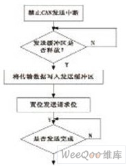 数据的发送由CAN控制器根据CAN协议规范自动完成。首先CPU必须将要发送的数据报文传送到CAN控制器发送缓冲器中,并置位命令寄存器中的发送请求标志,程序流程如图5所示。