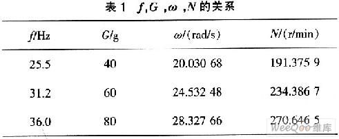 在实际应用中,通过计算机控制软件设定相应频率使转台在匹配的加速度下运行。表1中列出变频器频率f,转台法向加速度G,转台角速度ω,转台转速N之间的对应关系。