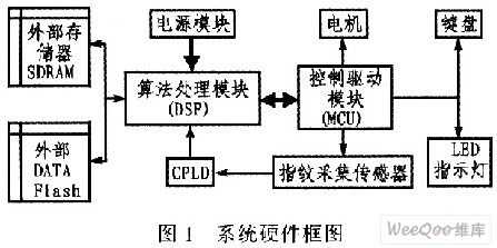 5)存储器模块包括外部SDRAM和外扩DATA Flash,前者用于存储临时比对的图像和一些变量,后者用于保存指纹特征库和DSP的BootLoa-der启动程序。