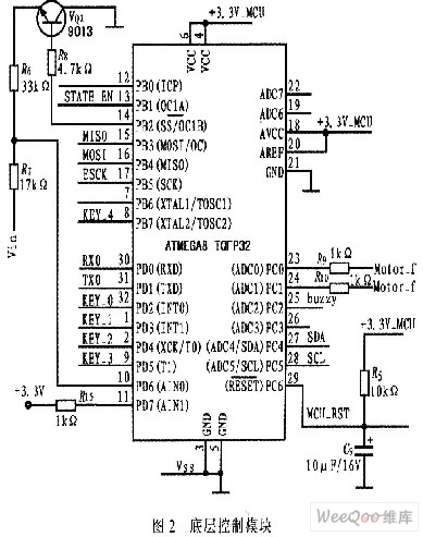 设计指纹锁,除了要有完整的中间构件——指纹识别模块,还需要配套的底层控制模块等基础构件。该系统选用高性能低功耗的MEGA8单片机作为底层控制模块的CPU处理器。该器件所实现的功能有:循环扫描键盘并进行相应处理;控制LED灯指示系统当前工作状态;驱动电机执行开关门锁动作;与DSP通讯交互信息等。如图2所示,单片机作为底层控制模块,其IO引脚控制其他器件,采用I2C与DSP进行信息交换。
