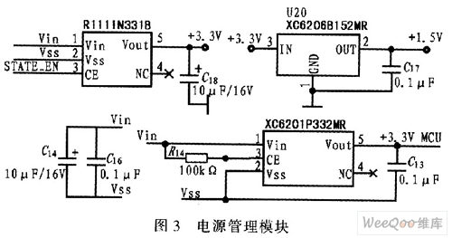 电源管理模块如图3所示,包括电源和电源管理器件。电源部分,该设计由4节1.5 V串联的干电池供电,此电压实际最高时为7 V左右,最低时为5 V,足以满足整体体统的电压要求。电源管理器件,选用手持设备中常用的低功耗高性能稳压器R1111N331B、XC62068152MR、XC6-206P332MR,输出33 V的整体电压和DSP 1.8 V的核心电压,这类器件的特点是它具有控制关断引引脚,在系统处于睡眠时,可以通过置位使能端,关断整个系统板的供电,从而达到低功耗节能的目的。