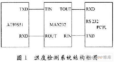 该系统的下位机选择Atreel公司的AT89S51单片机作为控制核心,负责采集现场温度值。温度传感器将温度转换为电压信号,经模/数转换器ADC0809转换成8位数字量,并经AT89S51的P1口进入单片机保存。上位PC机通过串行口与下位机联络,向下位机发送控制命令和接收下位机上传的数据以及进行人机交互。上位机采用VB 6.0进行人机交互界面设计,并利用其MSComm控件实现与下位机简单而高效的串行通信。充分发挥了单片机在实时数据采集和PC机对图形处理、显示以及数据库管理上的优点。使得单片机的应用已不仅仅局限于传统意义上的自动监测或控制,而是形成了以网络为核心的分布式多点系统的发展趋势。由于上下位机串行口工作电平不一致,它们之间通过MAX232芯片将单片机TTL电平转换为RS 232电平,构成如图1所示的系统结构框图。