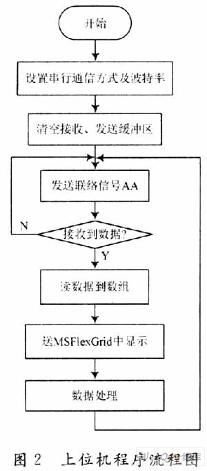 上位机主要负责发送控制命令,以及数据的接收、处理、计算、数据的显示等功能。上位机程序分为四个部分:界面设计、程序初始化、数据通信、数据处理。程序流程如图2所示。
