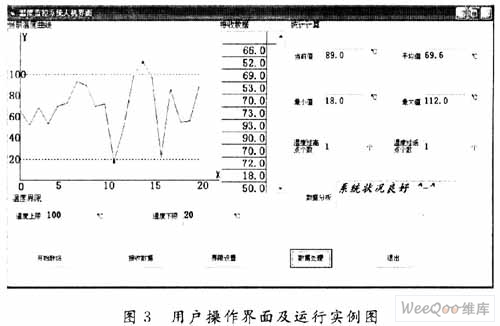 其中,温度界限部分主要用来显示用户自己设定的温度上下限;数据接收部分采用外部控件MSFlexGrid来显示已经接收过来的数据;统计计算部分用来显示对数据分析后的结果,如最大值、最小值、平均值等,最后对当前系统状况作出综合*判;温度曲线部分显示当前所有温度的变化情况,每个温度值对应曲线突出的一点,其中两条虚线内的点代表温度值在界限范围内,两条虚线外的两个点则表示该温度值超出了界限范围。