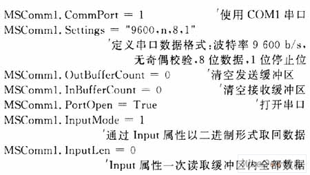 (2)Settings属性用于设置初始化参数。以字符串的形式设置或返回联机速率、奇偶校验、数据位、停止位等4个参数。其格式为:“BBBB,P,D,S”。其中,BBBB表示联机速率;P表示奇偶校验位检查方式;D表示数据位数;S表示停止位数。该系统设其为“9600,N,8,l”。
