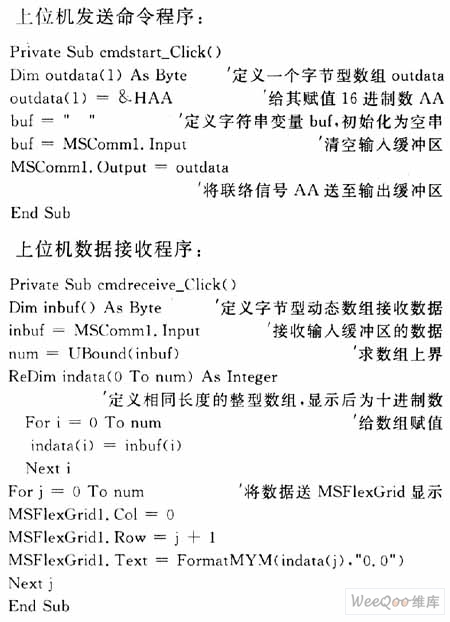 该程序由数据发送(联络信号)和数据接收组成。两部分程序分别写在对应的命令按钮“开始联络”、“接收数据”的Click事件下。具体程序代码如下: