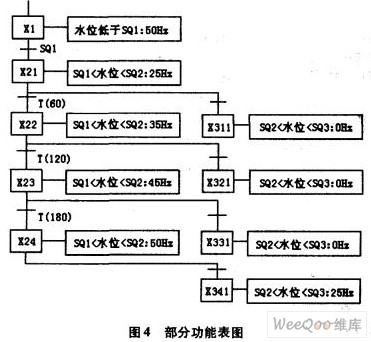(2)在一般的功能表图设计中,各工步的状态是唯一的,并且事先是已知的,故只需根据切换条件便可写出各工步逻辑表达式。但在本系统中,有的工步只有唯一的状态(如水位低于SQ1),有的工步却需要从4种状态中进行选择(如水位从SQ1上升至SQ2的过程中),而选择的依据则是上一工步的频率以及本工步的执行时间。因此,需要对一般的功能表图进行修改,在工步中加入分支选择,从而写出正确的逻辑表达式和梯形图。图4是针对水位由SQ1上升至SQ2这一工作过程而作的功能表图。结合I/O对照表便可进一步得部分梯形图(图略)。