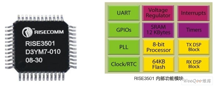 以RISE3501电力线载波芯片为例(见图),它内部集成了载波通信的调制解调模块,其物理层通信速率达5.5Kbps,并且内嵌一个高速8位CPU,内置12KB-SRAM内存和64KB-FLASH闪存。此外,该器件还拥有8个软件可配置GPIO口、8个可配置复用输入输出端口以及3个16位定时器等,具有可编程BPSK调制载波频点和可编程脉宽调制(PWM)输出等功能。