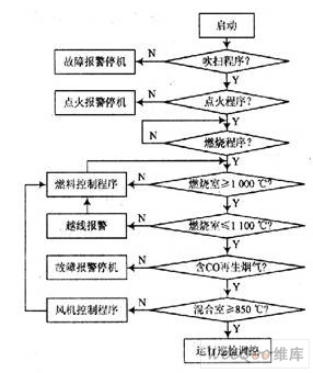 为满足CO焚烧炉的经济运行和安全生产,焚烧控制系统不仅具有备程序控制、负荷自动调节和安全保护等功能,各状态指示、报警及控制均可在PLC上自动实现。为此设计若干子程序分别实现自动点火、管道安全自动吹扫、泄漏检测、自动灭火和燃料补充等功能。