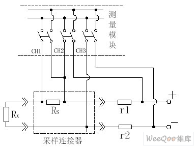 在进行可靠性试验时,要对被试系统各用电器进行全面的监控和准确的故障诊断,其前是:第一,能够从系统中获得足够多的可及测试节点但不能破坏被试系统完好性;第二,信号I/O 接口必须连接可靠,能够耐受高强度试验应力而不先于被试系统发生故障。按UUT 类型确定待测信号和采样节点,并以汽车电器实际使用的连接器作为信号输出接口,设计采样连接器接入电路可获取监控所需的信号。图2 说明了某一阻性电器单元的采样方法。原状态下汽车用电器单元Rx 直接与汽车电线束连接形成工作回路,其正负极回路电阻分别为r1、r2,阻值未知;试验时将包含图示电路的“采样连接器”接入,便可在不影响原电路工作的情况下获得电路状态参数。