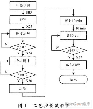 若将控制开关置于自动状态,按下启动按钮SB3即打开煮料进料阀门,向煮料器内加入生产所需的原料(进料);当液位传感器检测到进入煮料器中的液位到达规定位置时,其开关信号X25(SL)输入可编程序控制器控制关闭进料阀门,同时起动搅拌电机,对原料进行搅拌,并打开热气阀门Y4,通入热气对原料进行加热(煮料),由温度传感器X24(STl)检测原料的温度,当原料温度达到90℃时,停止加热;此时打开冷却水阀门Y5,加快冷却水的循环速度,实现快速降温(冷却),当原料的温度冷却到60℃时,温度传感器开关X26(ST2)动作信号输入可编程序控制器,控制冷却停止(完成煮料过程)。接着打开输料均质阀门,使煮料锅中的原料进入均质器中搅拌,设定均质时间10 min,时间达到后,打开老化工艺阀门Y3,原料进入老化器中,在老化器中再次进行温度冷却(老化)。在老化器内,由温度传感器检测原料的温度,当原料温度冷却到40℃时,开关X27(ST3)动作信号输入可编程序控制器控制冷却停止,此时加工完成,输出成品灌装。
