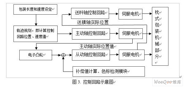 下面以图2所示的三轴伺服枕式包装机控制系统为例对系统各部分进行说明,该枕式包装机横向封切方式为热封冷切,即先进行热封,再进行横切。系统也能方便地通过设置,兼容常见的热封热切工艺。设备运行过程中,横封横切刀的运行速度保持匀速(以下简称主动轴),送膜轴(以下简称从动轴)的速度以凸轮关系运行,并引入色标补偿。凸轮的功能是并保证在横封和横切时,送膜轴的运动和横封刀以及横切刀的在切割点的运动保持严格同步。送料轴以送膜轴的实际运动速度和位置,与之保持严格同步。切刀近点传感器信号的引入是应某枕式包装机制造商的要求而设置的,目的是为了防止色标信号的误检测。此功能也可以不用引入传感器信号,而在系统内部以软件的方式实现。