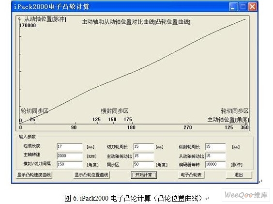 图6和图7显示了iPack2000电子凸轮的计算,图6显示的是主动轴位置和从动轴位置值的对比曲线,其中横坐标是主动轴位置值,纵坐标是从动轴的位置值。图7显示的是在一个包装区间内从动轴的速度曲线,从中可以看出有两个速度同步区,分别是横封同步区和横切同步区。对于常见的热封热切工艺,则只需要设置一个同步区即可。