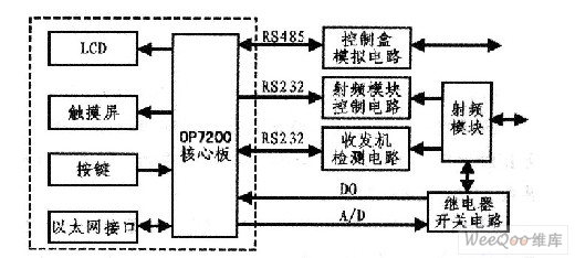 OP7200作为应答机自动测试系统的控制和显示单元,负责整个系统测试任务的调度,数据处理、接口控制、结果显示等多种任务,其接口如图4所示。它完成的任务包括以下几种:1)界面显示,由LCD显示屏完成;2)界面切换、工作模式选择与控制、参数输入等,由触摸屏完成;3)测试界面的切换,由9个按键(其功能可被触摸屏代替)完成;4)继电器开关电路中的通道选择,由8路数字输出完成;5)测量检波器输出的电压,判断收发机是否工作,由1路A/D转换完成;6)收发机检测电路的通信和射频模块控制电路的通信,分别由2个3线RS232接口完成;7)控制盒模拟电路的通信,由RS485接口完成;8)信息交互由以太网接口完成。同时,0P7200采用27 V直流供电。