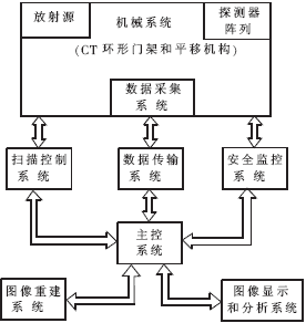 a)完成对集装箱的DR扫描和CT扫描的流程控制。本检测系统的扫描模式有正视投影、俯视投影、双投影、CT扫描和常规扫描(双投影加CT扫描);(b)与扫描控制系统和安全监控系统进行通讯,发送流程控制命令并接收检测系统反馈的状态信息;(c)与数据传输系统进行通讯,发送集装箱扫描模式命令和数据采集控制命令,接收数据采集系统获取的原始集装箱DR图像和CT图像,并实时显示和保存原始集装箱图像; (d)与图像重建系统进行通讯,把所获得的原始集装箱DR图像和CT图像分配给图像重建系统,分别进行刻度校正和图像重建;(e)与图像显示和分析系统进行通讯,把经过图像重建系统处理后的集装箱DR图像和CT图像分配给图像显示和分析系统,以对集装箱图像进行检查,确定所检测的集装箱中是否有可疑的违禁物品。