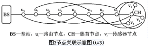 为尽早检出和丢弃由被攻击节点注入的虚假数据包,以达到安全需要和降低由此产生的能源消耗,文献将交互验证的思想进一步扩展,在簇首节点到基站的数据传送链路上的各个节点间建立关联关系,如图3所示,从而所有节点以一种交错的逐跳方式验证其要传递的数据包。只有t+1(t是设定的安全上限,取簇内的节点数)个节点全部通过认证,数据包才能被传递到基站,因此,只要被攻击的节点数小于等于t,基站或没有被攻击的节点就能检测出并丢弃由入侵者注入的虚假数据包。