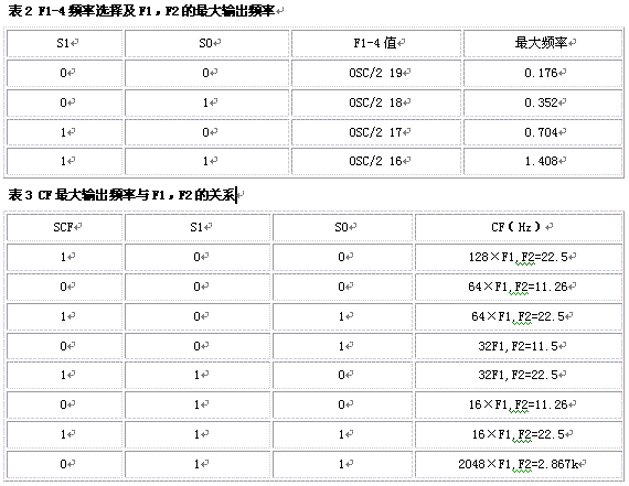 表3所列为CF最大输出频率与F1、F2之间的关系。当逻辑输入SCF为0,而S1和S0为1时,其最大值为2.867kHz。
