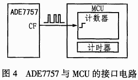 ADE7757与微控制器最简易的连接方式可利用CF的高频输出来完成。连接时,可将CF设置为最大输出频率(如图4所示),并将CF连接至MCU计数器或接口,然后在MCU内部定时器规定的时间内计数脉冲,并取平均功率等于平均频率,同时,该值也等于计数所得值与计数时间的比值。这样,此计数时间内所消耗的能量为平均功率与时间的乘积,也就是说计数值/时间与时间乘积的计数值。