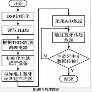 基于硬件结构的设计搭建起来的测试系统,需要通过DSP 的软件算法和上位机的软件设计来实现。DSP 的软件算法需要实现以下几个功能:读取标准化传感器电子数据表(TEDS),控制并调整各个数字电位器,传感器信号的采集和计算,对蓝牙模块的接口控制设计。上位机软件的设计是为了达到对主蓝牙单元的控制以及显示最终测量结果,软件流程如图8所示。