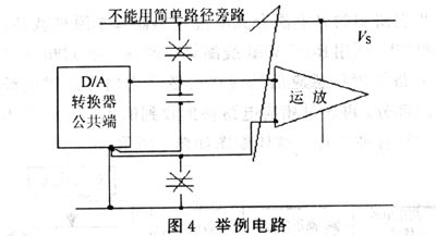 图4说明这样一种方法,他应用于模拟量输出运算放大器对于数/模转换器数字驱动噪声的去耦,如果旁路电容随意地直接接到电源的两根母线之间,旁路电容起不到应有的作用,甚至可能有害,他从"不干净"的到"清洁"的Vs,为噪声提供低阻抗的交流通路。