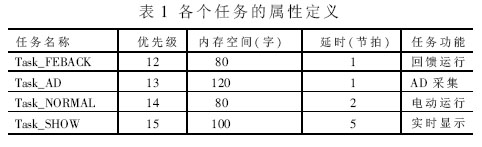 任务延时是指任务执行完毕处于挂起等待状态到下一次重新运行之间的时间间隔,它的单位是时钟中断节拍。由于OS_TICKS_PER_SEC为1000,每一拍为1ms。每个任务的调用间隔不能小于一个节拍,它将影响模拟量的采样频率。各个任务的属性定义如表1所示。
