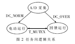 各个任务是通过抢占CPU的使用权来运行的,它们之间存在一定的逻辑关系,彼此互相联系又互相制约。信号量、邮箱、消息队列等功能为实现任务间通信提供了有力工具,它们的使用方法灵活多变,如用信号量设置事件标志,唤醒任务、用邮箱在任务间传递参数、用消息队列的循环寻址功能进行模拟通道的数据采集等。本文设计了两个信号量,在系统运行开始后,任务TASK_AD检测直流侧电压的大小。当电压未超过设定值时,发出信号DC_NORM唤醒任务Task_NORMAL;当电压高出设定值时,发出信号DC_OVER唤醒任务Task_FEBACK。虽然这两个任务基于不同的控制结构,采用不同的算法,但都要使用PWM输出和SPI通信口,所以在唤醒一个任务的同时必须让另外一个任务挂起。这里引入了互斥型信号量T_MUTEX实现这个功能。得到T_MUTEX信号的任务将独自占有共享资源的使用权,两个任务不会因资源冲突而同时挂起,解决了任务间优先级反转问题,避免了系统功能失效。任务间逻辑关系如图2所示。