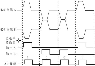ARINC429(以下简称429)总线采用双绞屏蔽线传输信息,通过一对双绞线反相传输,具有很强的抗干扰能力。而调制方式则采用双极归零制的三态码方式,即信息由“高”、“零”和“低”状态组成的三电平状态调制。429电缆上的信号及经电平转换后的信号如图1所示。429总线每一个字为32位,它的字同步是以传输周期至少4位的时间间隔也就是4位码字为基准的。