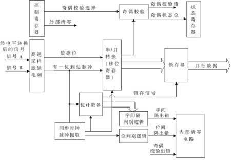 接收部分的主要作用是通过串/并转换将串行数据转换为32位并行数据,并对收到的数据自动实行差错控制。对于字间隔、位间隔出错等错误能进行自动检测,若无错误,则将数据分两次送至DSP的16位数据总线上,以供读取。接收模块结构框图如图3所示。