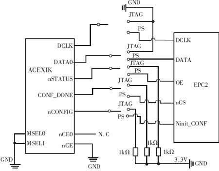 FPGA内部结构是基于SRAM的,因此需要一片配置芯片固化内部逻辑。为了便于调试,采用JTAG模式和被动串行模式(PS)两种配置模式,调试时使用JTAG模式直接将逻辑写入FPGA内部,调试好后再用PS模式将程序写入配置芯片。通过对FPGA和配置芯片上的引脚进行跳线,可选择不同的配置方式。跳线电路如图5所示。