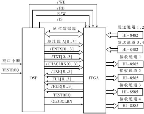 以上介绍的只是一路发送通道和接收通道,由于本系统共有四路独立的发送通道和四路独立的接收通道,故在FPGA中需设置四个接收模块和四个发送模块,通过DSP的地址线来选取其中的一路发送通道或接收通道。
