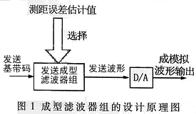 成型滤波器组的设计原理图如图1所示。成型滤波器组包括一组成型滤波器。相同的发送基带码经成型滤波器组中不同的成型滤波器滤波后,会产生不同延时的发送数据波形。发送数据波形的延时不同,则发送时刻也不同。这就是说,相同的基带码经过不同的成型滤波器滤波后可产生不同发送时刻的波形。因此,以测距误差作为选择字,根据误差的大小选择相应的成型滤波器,就可间接地调整发送基带码的时刻。