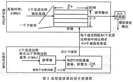 通常,系统时钟频率远高于基带码的速率,因此在成型滤波前,要在基带码的相邻码之间进行内插。内插的方式有多种,通常的内插方法是在发送的基带码的相邻码之间内插“0”。将基带码插“0”后,与低通滤波器的冲激响应卷积,再送到D/A转换器转换成模拟滤波器就可以实现滤波成型。设计低通滤波器时,为了得到较好的波形,通常采用高阶的FIR滤波器。如果在FPGA中用逻辑单元实现高阶FIR滤波器,全占用大量的逻辑单元。比如在 Altera 公司的FPGA中用逻辑单元实现一个50阶的FIR滤波器,需要26个乘法器和50个加法器,要占用一千多个逻辑单元。而本文利用FPGA中的ROM,用查表的方法设计同样的FIR滤波器,则只需占用几十个逻辑单元。图2是成型滤波器的设计原理图。该设计包括用数学工具——MATLAB预先设计的部分和在 FPGA中实现的部分,MATLAB完成成型滤波后的数据波形文件的设计。FPGA存储设计好的数据波形文件,并用发送的基带码选通相应波形的存储地址,完成滤波成型。