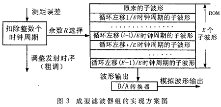 各移位后的子波形按循环左移大小依次存储在ROM中。因此一个时钟周期的延时被划分成了E个区间,将测距误差除以时钟周期,得到余数R,计算出R落在了E 个区间中的哪个。选择该区间的子波形,将该子波形送到调整步长降到时钟周期的1/E。实际设计时,在MATLAB中将FIR滤波器的冲激响应以时钟周期的 1/E循环左移,再与插零后的基带码卷积,就实现了子波形的循环左移。再通常的系统实时产生的滤波是则系统时钟控制的,延时不会小于一个时钟周期,因此其调整精度远不如用MATLAB设计的成型滤波器组的方法。