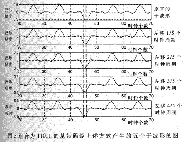 由于时钟周期为50ns,当要求最小调整步长不大于10ns时,在MATLAB中将FIR滤波器的冲激响应以时钟周期的1/5循环左移,再与插零后的基带码进行卷积,就可以得到以时钟周期的1/5循环左移0,1,2,3,4次后形成的五个子波形。图5是组合为11011的基带码经上述方式产生的五个子波形的图。