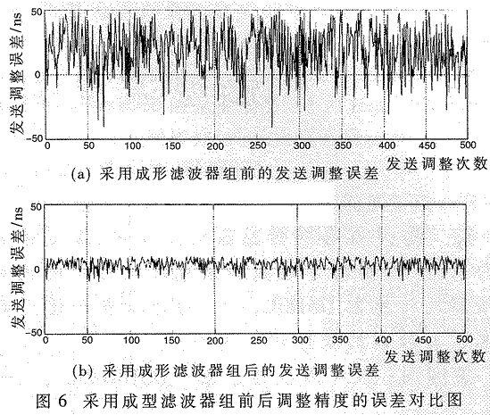 图6是采用成型滤波器组前后调整精度的误差对比图(假设测距误差估计服从高斯分布,均值为25ns,标准差为25ns)。